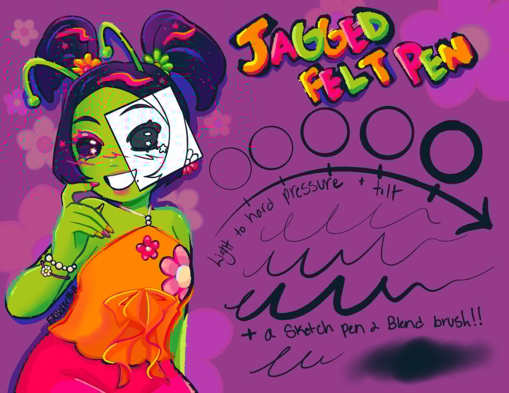 Looking for a brush thats flexible, smooth, but also has that pixelated charm? Good news! I’ve spent lots of time searching for my dream brush before finally deciding to make it myself and I’m here to share it with you. This set of four brushes includes the thick Jagged Felt Pen with four saved sizes, a Fine Jagged Felt Pen, a sketch pen(my personal favorite style of brush to draft ideas with), and a Soft Accent brush for blending and gradients. The Jagged Brushes have a higher tilt function and pressure abilities to maximize flexibility usage, but feel free to tinker with that!